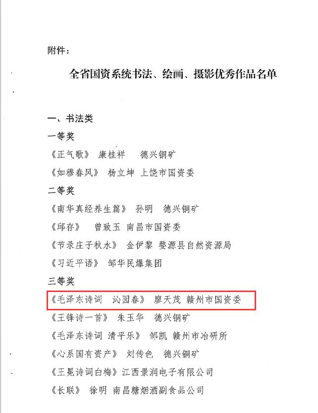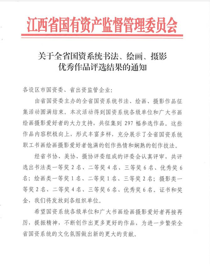 近日,江西省國(guó)資委公布了《關(guān)于全省國(guó)資系統(tǒng)書(shū)法、繪畫(huà)、攝影優(yōu)秀作品評(píng)選結(jié)果的通知》,集團(tuán)選送的書(shū)法作品——《毛澤東詩(shī)詞 沁園春》(作者:廖天茂)榮獲書(shū)法類“三等獎(jiǎng)”。
